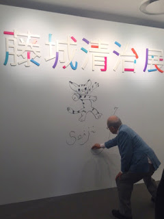 先生は開会式が終わった後に展示室をご覧になり、壁に直筆の文字やイラストを描かれました。かわいい猫ちゃんたちが、皆様を歓迎します♪